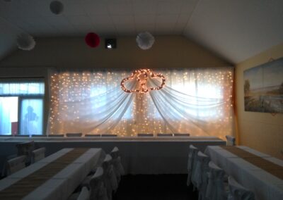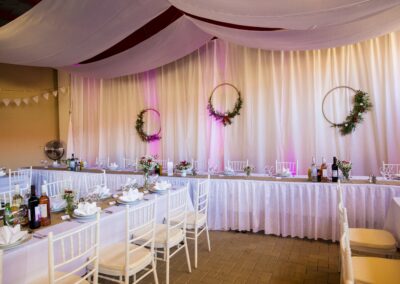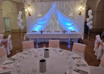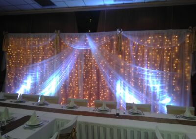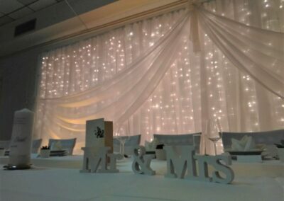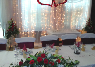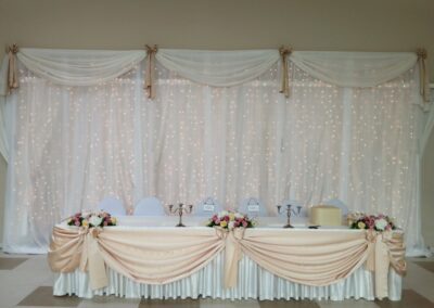 Mit der Hintergrunddekoration ist die Verzierung der Fläche hinter dem jungen Paar gemeint. Es gibt keinen besseren Weg, sich von der Masse abzuheben. Die eigene Dekoration des Haupttisches passt perfekt zu den anderen Elementen der Dekoration, ist aber mehr als das – so wie Sie an diesem Tag auch ein bisschen mehr sein werden.